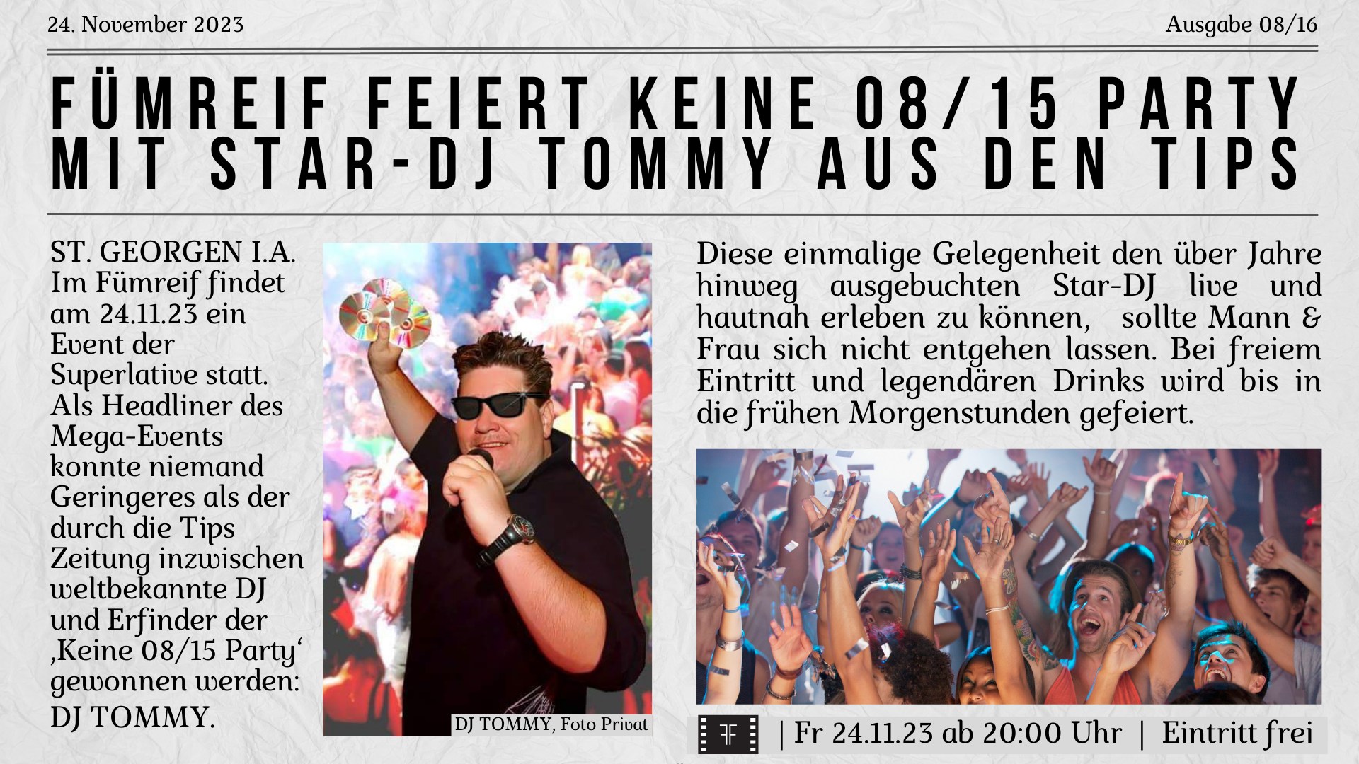 Als Headliner des Mega-Events konnte niemand Geringeres als der durch die Tips Zeitung inzwischen weltbekannte DJ und Erfinder der ‚Keine 08/15 Party‘ gewonnen werden: DJ TOMMY.